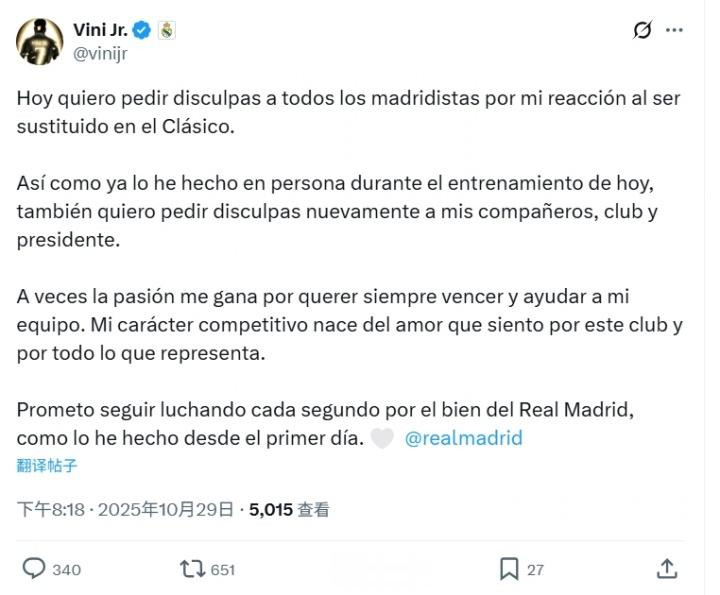 直播吧10月29日讯皇马边锋维尼修斯在社媒发布了一则道歉声明,因在国家德比中被换下时的争议行为向球迷、队友、球队和俱乐部主席道歉,而致歉中并未提到主帅阿隆索。